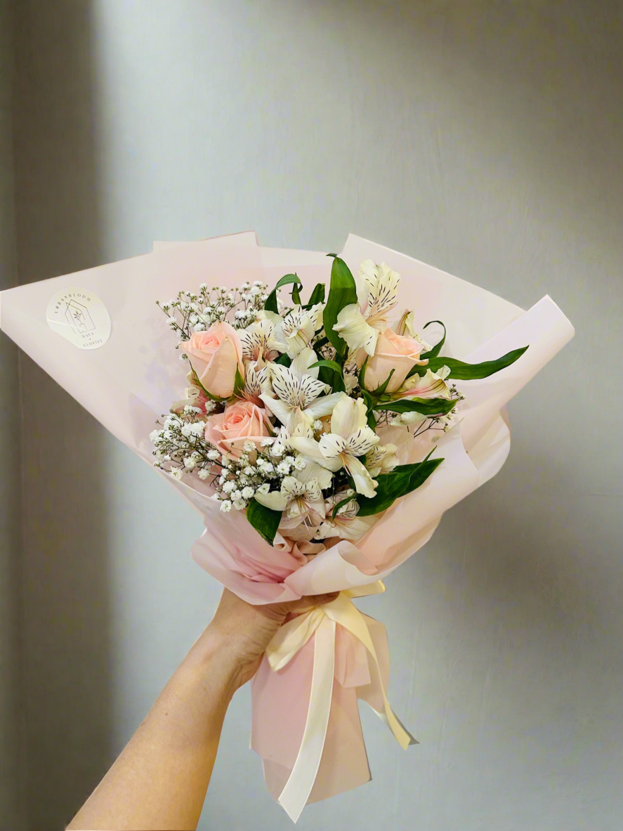 Peruvian Lily, pink rose, baby's breath filler and foliages