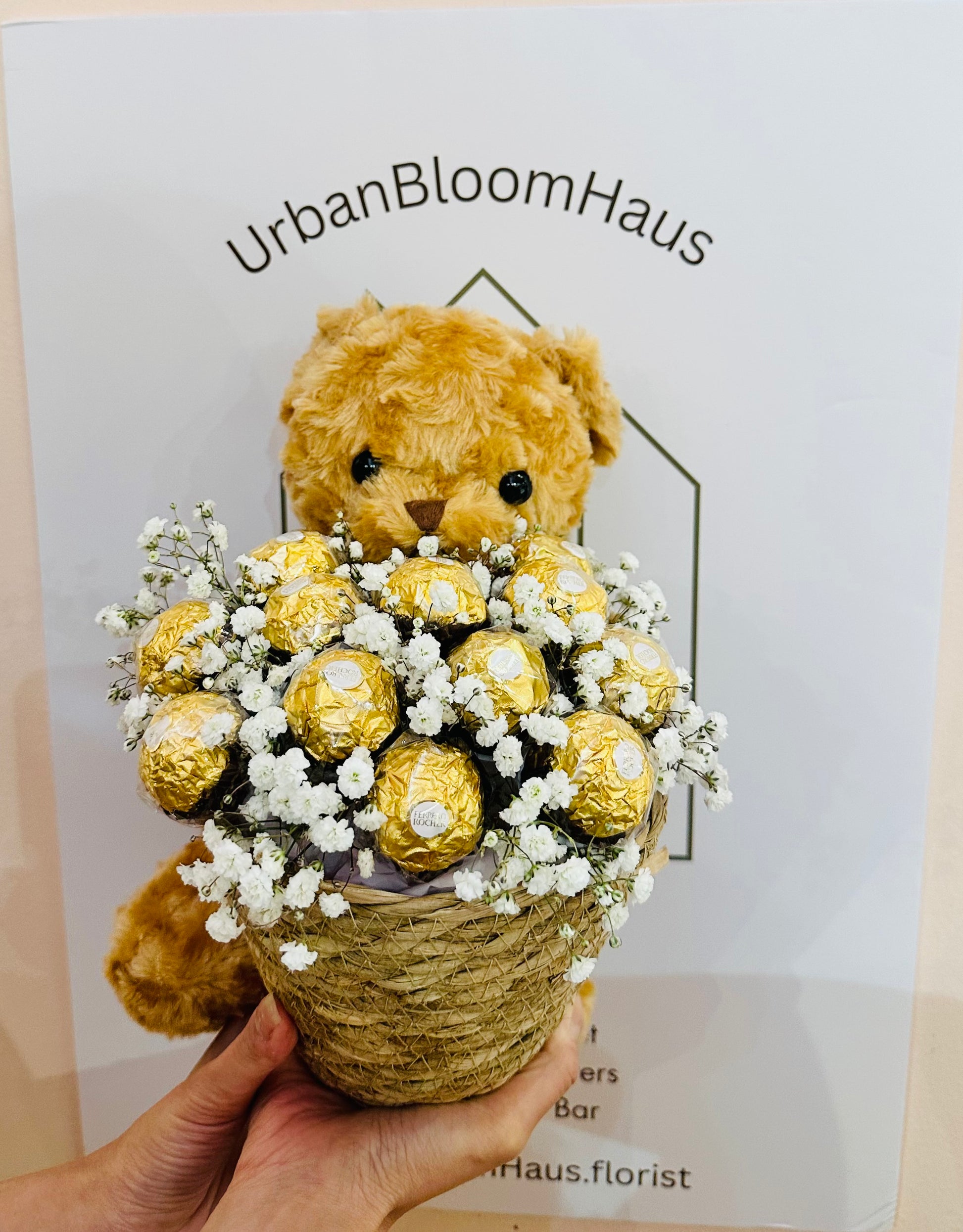 Comes with detachable brown bear, 12 pcs of Ferraro Rocher chocolates and fresh baby’s breath